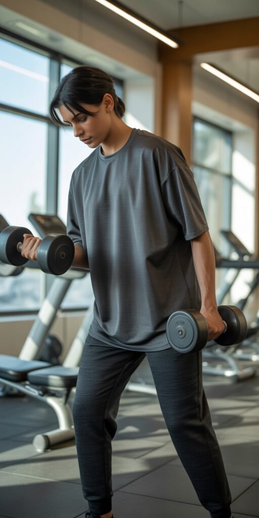 Joggers give warmth without heaviness. As long as the fabric stretches, you can lift, lunge, and move without restriction. This outfit feels calm and grounded, which I love for strength training.